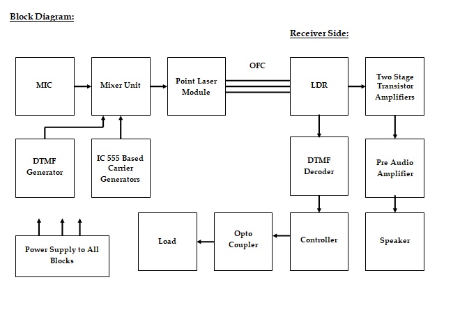 By using Laser Beam we can communicate or transmit the signal from one end to another end. First of all electrical signal is converted into light and then transmitted to far end in open space. In the receiver end laser detector is used to sense the signal. By using this technique without any hardware media we can send the voice signal without any loss for long distance. In our proposed system voice and load control operation is carried on. To control the different electrical load DTMF coding technique is used. In transmitter side mic, DTMF Generator, Mixer Unit and laser source are used to transmitted signal. In receiver side, LDR Based opto source, DTMF Decoder, amplifier and switching relay are used to re produced the audio signal and decode the control signal.